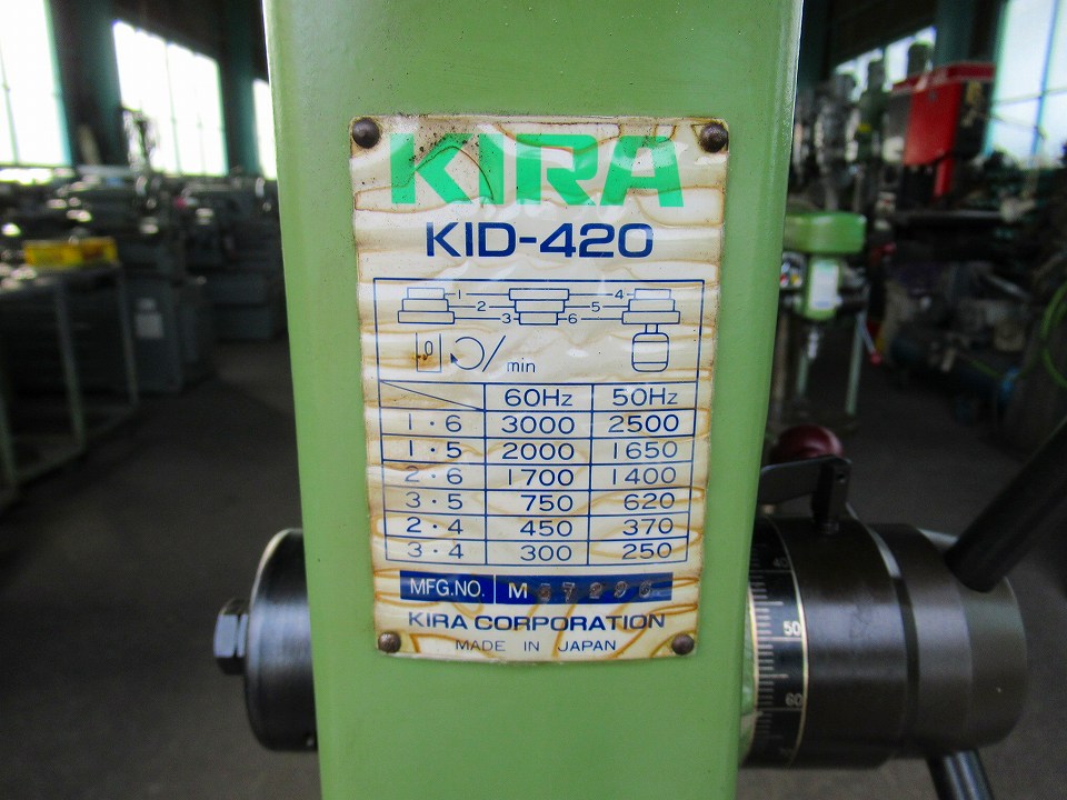 | 主仕様 | 切削能力ドリルφ23, 主軸テーパーMT#2, 主軸回転数300~3000rpm(5段), 主軸ストローク130, 主軸~テーブル距離425(丸)470(角), 振り420, モーター0.75kw 4P, |