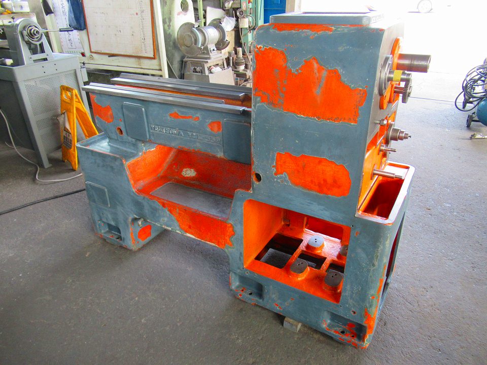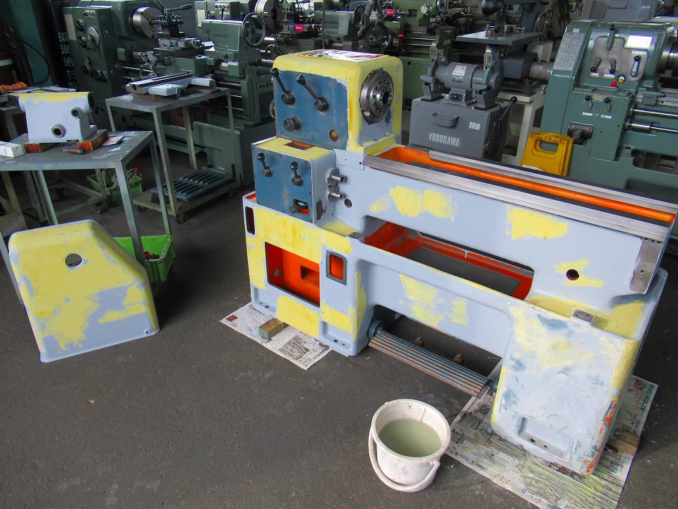 今回は在庫機の中古旋盤のオーバーホール作業として、分解洗浄および塗装前の下地処理を