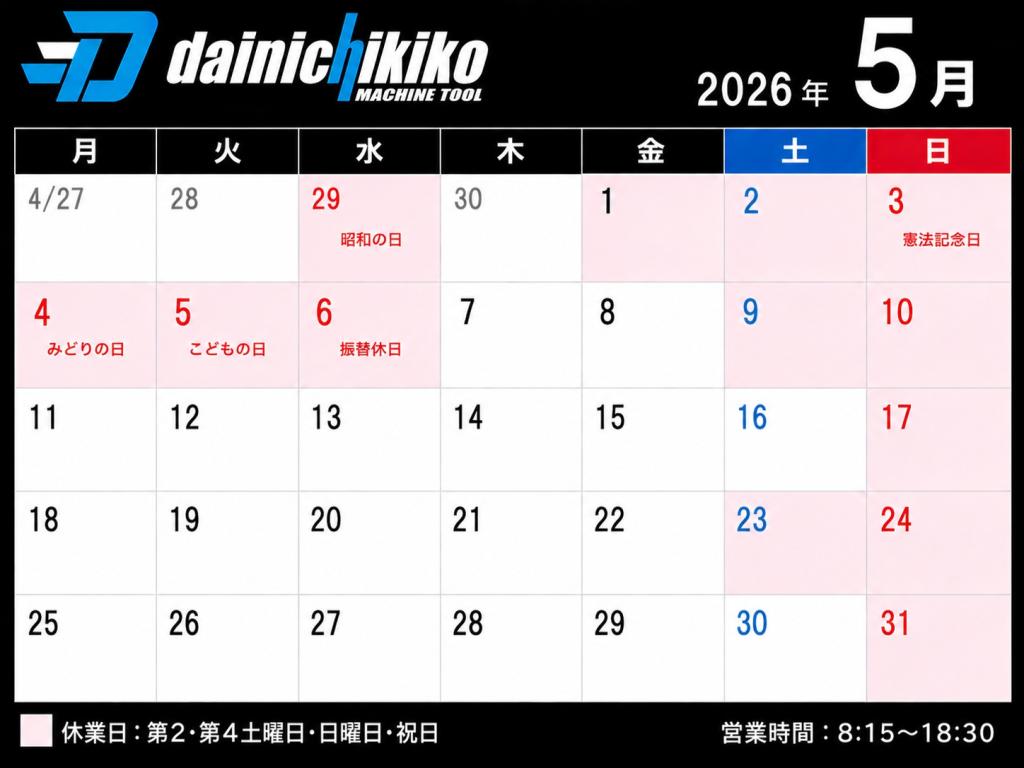 お知らせ5月の営業日案内ゴールデウィークを含めた5月の営業日のお知らせになります いつもご愛顧頂きまして誠に有難う御座います。5月の営業日のご案内となります。ゴールデンウィークを挟みまして一部変則的な営業となります。お急ぎのお客様にはご不便をお掛けして申し訳御座いませんがご確認のほど宜しくお願い致します。中古機械の在庫情報はコチラから静岡県で中古工作機械・鍛圧機械・加工工具・工場周辺機器をお探しの方へ中古工作機械の販売・買取を行っています!プロの目で安心査定整備された工作機械の重要性|中古工作機械を長く使うために中古工作機械販売・買取・修理のことなら(株)大日機工へ