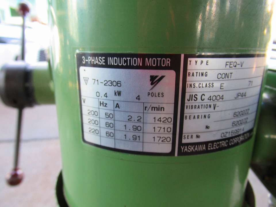 | 主仕様 | 切削能力ドリルφ13, 主軸テーパーJT#6, 主軸回転数500~2800rpm(4段), 主軸ストローク80, 主軸~テーブル距離468(丸) 498(角), 振り330, モーター0.4kw 4P, |