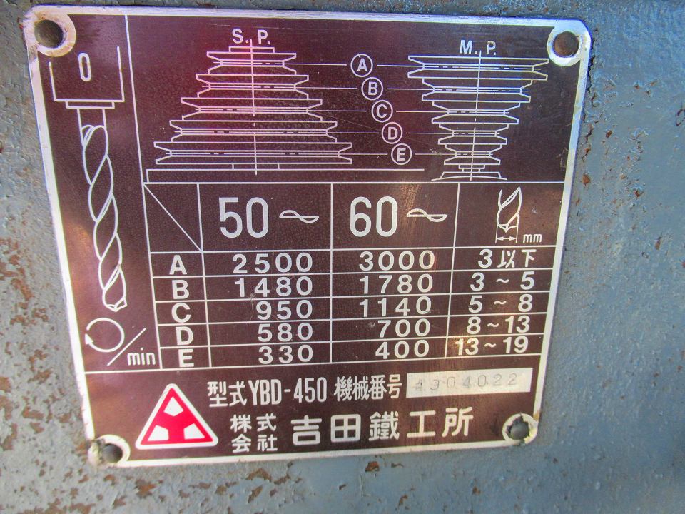 | 主仕様 | 切削能力ドリルφ19, 主軸テーパーMT#2, 主軸回転数370~3000rpm(5段), 主軸ストローク140, 主軸~テーブル距離550, 振り450, モーター0.75kw 6P, |